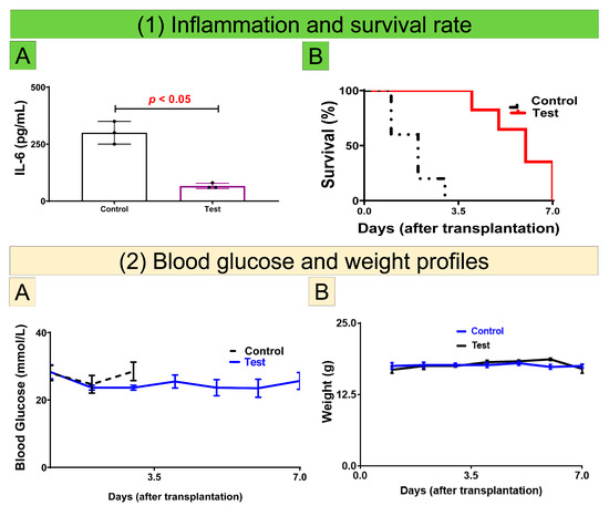 Figure 4 shows plasma levels of the proinflammatory biomarker, IL-6 (Figure 4(1A)), survival rate (Figure 4(1B)), blood glucose (Figure 4(2A)), and weight (Figure 4(2B)) of transplanted mice. As it can be seen, mice transplanted with islets-loaded microcapsules survived for several days longer than the control (non-CDCA microcapsules) group (Figure 4(1B)) as well as displayed improved blood glucose levels (Figure 4(2A)), which was complemented with corresponding decreases in the plasma levels of the pro-inflammatory cytokine IL-6 (Figure 4(1A)). As can be seen in Figure 4(2B), both the control and test showed results of similar weight profiles. The amounts of pro-inflammatory cytokine IL-6 present in the plasma of recipient mice treated with CDCA-islet microcapsules were more than 60% lower than the group treated with microencapsulated islets, suggesting an immune-protective effects of CDCA.