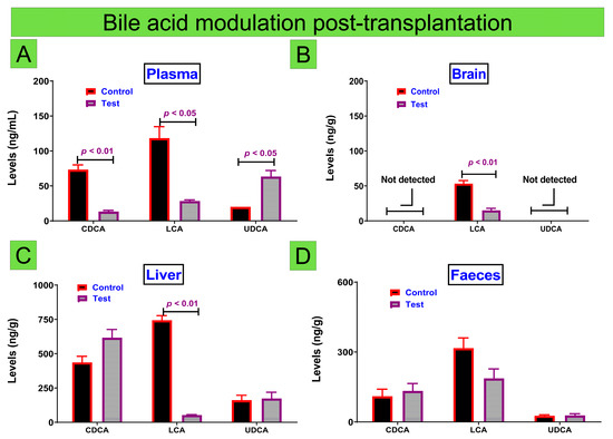 Figure 5 shows the levels of endogenous bile acids (CDCA, LCA, and UDCA) in plasma (Figure 5A), brain (Figure 5B), liver (Figure 5C), and feces (Figure 5D) in both groups of mice: control and test.