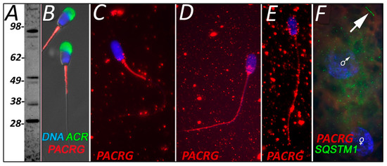 PACRG was detected in ejaculated spermatozoa using WB at multiple molecular masses (Figure 3A) and found to localize to the mitochondria sheath (Figure 3B). Within our cell-free system control group, this mitochondrial sheath localization pattern was unaffected by sperm priming and 4 h of exposure to extract buffer, which lacked oocyte proteins (Figure 3C). However, spermatozoa that were exposed to oocyte proteins in the proper cell-free system for 4 h displayed a dramatic change in PACRG localization (Figure 3D). At this point, PACRG was found to be diminished in the mitochondrial sheath, but now detectable localize throughout the rest of the sperm tail and also in the sperm head post acrosomal sheath. After 24 h of cell-free system exposure, PACRG was still detectable within the sperm tail principal piece and throughout the head of the spermatozoa but absent from the sperm tail midpiece/mitochondrial sheath (Figure 3E). Finally, we screened for PACRG in a one-cell zygote, where it was no longer detectable on the mitochondrial sheath or the rest of the sperm tail (SQSTM1 was used as a mitochondrial sheath indicator) (Figure 3F).