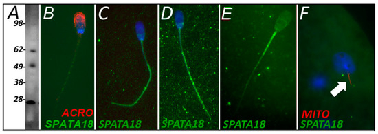 SPATA18 was selected as a candidate pro-mitophagic protein because of its known function, implied by its sobriquet (mitochondria-eating protein), which is to degrade damaged mitochondria within a somatic cell. SPATA18 was detected in spermatozoa using Western blotting (Figure 4A) and immunocytochemistry (Figure 4B). SPATA18 was found throughout the sperm tail both before and after 4 h of oocyte extract exposure (Figure 4C,D). This localization shifted after 24 h of oocyte extract exposure and clearly became prominent on the mitochondrial sheath, while it was diminished, in a complementary fashion, in the sperm tail principal piece (Figure 4E). However, when observed in a one-cell zygote, neither localization pattern was detectable in the tails of the spermatozoa present in the fertilized oocyte cytoplasm (Figure 4F).