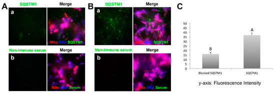 To determine if a conspecific antibody treatment prevents ooplasmic SQSTM1 binding to sperm mitochondria in the cell-free system, the permeabilized spermatozoa were co-incubated with oocyte extracts for 4 h, and an anti-SQSTM1 antibody was added to the mixture at the onset of co-incubation. This treatment prevented ooplasmic SQSTM1 from binding to sperm mitochondria (Figure 6(Aa)), while the SQSTM1 was detectable on sperm mitochondria after sperm-extract co-incubation without the addition of anti-SQSTM1 antibody (Figure 6(Ba)). Non-immune serum was used to generate negative controls for immunofluorescence and confirm treatment specificity (Figure 6(Ab,Bb)). Consistently, the intensity of SQSTM1-induced fluorescence labeling on the sperm midpiece/mitochondrial region was significantly lower (p < 0.05) after co-incubation with oocyte extract containing anti-SQSTM1 antibody (Figure 6C). This result agrees with the observations of porcine zygotes in which pre-injection with anti-SQSTM1 antibody blocked translocation of ooplasmic SQSTM1 to the sperm mitochondria post-fertilization [8].