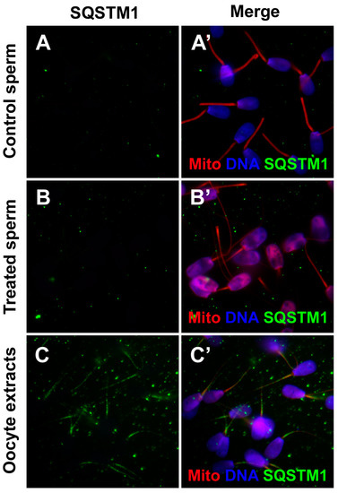 We further examined if SQSTM1 derived from porcine oocyte extracts was detected in the interspecific cell-free system composed of porcine oocyte extract and bull spermatozoa. Non-treated (membrane-intact), control bull spermatozoa and bull spermatozoa treated with 0.05% lysolecithin and 10 mM DTT were immunostained with anti-SQSTM1 antibody. The SQSTM1 was not detectable in bull spermatozoa without exposure to porcine oocyte extracts (Figure 7A,A’,B,B’), whereas SQSTM1 originated from porcine oocyte extracts was visible in the midpiece/mitochondrial sheaths of bull sperm tails exposed to oocyte extract (Figure 7C,C’), suggesting that even in the interspecific conditions of the cell-free system, ooplasmic SQSTM1 was still able to recognize heterospecific sperm mitochondria.