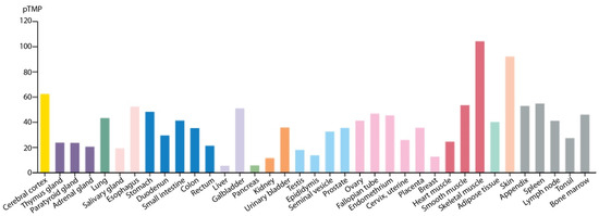 Plectin expression in different tissues. The expression data have been downloaded from the tissue atlas of the Human Protein Atlas (https://www.proteinatlas.org/ENSG00000178209-PLEC/tissue, accessed on 1 June 2021). The data are based on deep sequencing of RNA from 37 major different normal tissues types [9]. TPM, transcripts per million, used as normalization value.