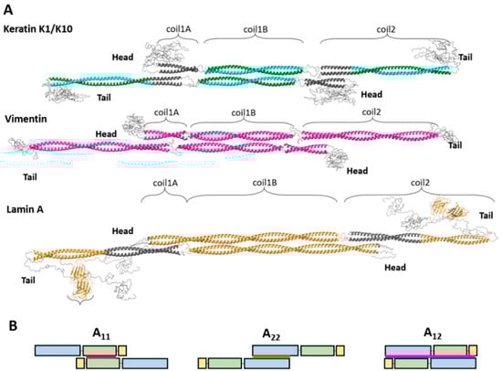 Notably, the A11 type tetramer can be formed by a vimentin fragment corresponding to coil1B alone, as evidenced by its crystal structure [], followed by a very similar tetrameric structure for the coil1B fragment of GFAP. Along with keratin heterodimers, the A11 alignment was clearly seen in cross-linking studies, while the crystal structure of a K1/K10 fragment corresponding to coil1B revealed the same arrangement [,,,].