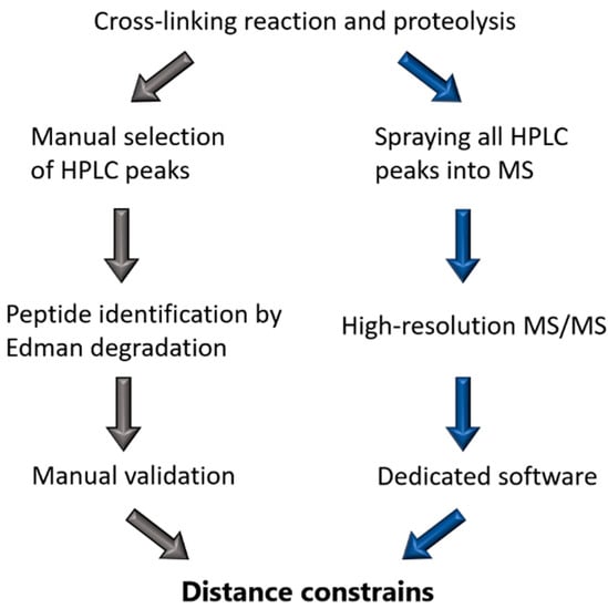 In contrast, the modern procedure to identify the cross-links is based on high-resolution MS. To this end, either the whole cross-linked sample or individual bands cut out of an SDS-PAGE gel are digested first with trypsin. The obtained peptide mixtures are then subjected to fractionation through liquid chromatography, typically followed by electrospray-ionization MS/MS [] (Figure 2). Hereby, it is critical that high precision MS and fragment spectra are acquired. It should be noted that the use of a repertoire of cross-linkers including MS-cleavable ones as well as specific software tools typically enable a reliable assignment of a much larger number of cross-links than before, including those occurring at lower frequency [,,].