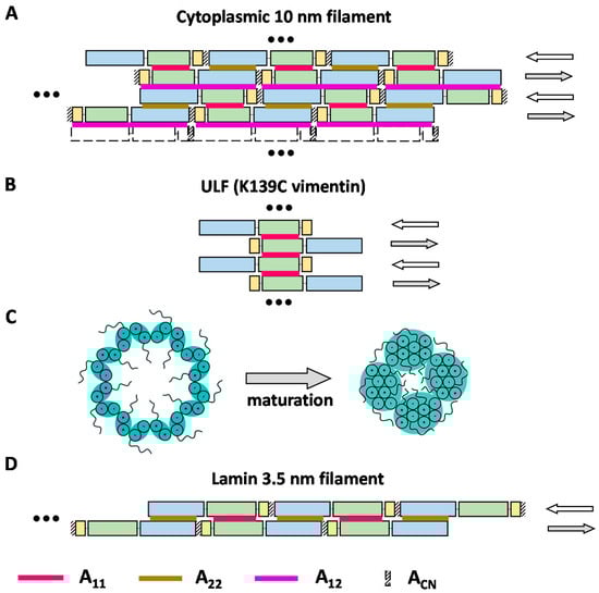 Cross-linking studies of the cytoplasmic ULFs were thus far limited to a single publication []. Here, the standard technique of Steinert was applied to the K139C mutant of vimentin, which was arrested at the ULF stage at 21 °C [,]. Interestingly, this study suggested that the ULFs predominantly contain A11 type contacts (Figure 3B). It should be noted that such arrangement does not allow a straightforward explanation. Indeed, for a simple longitudinal docking of such A11, only ULFs as rigid bodies cannot yield the complete palette of dimer–dimer contacts observed in mature filaments (A11/A22/A12/ACN), as may be seen from comparing Figure 3A,B. Instead, major rearrangements including sliding of individual dimers or tetramers would be necessary to enable the formation of all four contact types.