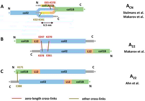 As a result, Steinert and colleagues have established that the overall cross-linking patterns were rather similar for type I/II (keratins), type III, and type IV filaments. Most importantly, the obtained cross-links could be consistently classified as belonging to one of three distinct modes of lateral alignment of dimers, A11, A22, and A12 (Figure 1B) [,,,]. The first mode could later be confidently assigned to the soluble tetrameric species as discussed already. For each of the three modes, the exact alignment of individual coiled-coil segments could be calculated as providing the best match to the experimental restraints. This alignment was then used to derive the lengths of the linkers connecting these segments.