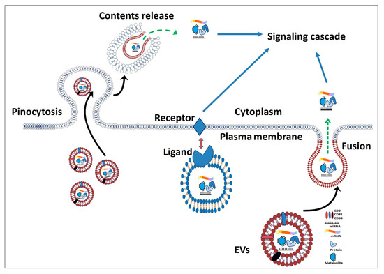 Schematic illustration of extracellular vesicles (EVs) uptake and cargo release to the target cells. EVs can fuse with the plasma membrane and deliver the molecular cargo into the cytoplasm. The EV surface protein can interact with cell receptors and deliver a signal pathway. EVs may be up-taken into the cells through pinocytosis where lysosomes can recycle or release their contents into the cytoplasm. The molecular contents of the EVs reflect the cell of origin and exhibit their actions when they become free from the lipid bilayer.