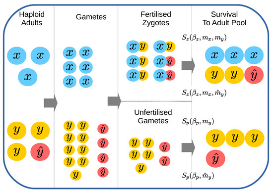 Zygotes and parthenogens survive, according to Equations (2) and (3), respectively, to become the new adult generation. Since we assume that adults are haploid, we assume fertilisation is followed by meiosis to yield this outcome (as in e.g., Chlamydomonas). The adult population is thus a mixture of individuals that represent unfertilized parthenosporophytes (inheriting the genetic identity of their parent with certainty), and those that are haploid products of meiosis that occurs after fertilisation (inheriting the gamete-size-linked mating type of either parent with a probability of a half; this corresponds to the term in Equation (1) of [25]). Our model can thus be considered a stylized version of the isogamous green algae Chlamydomonas reinhardtii [45] or the anisogamous green algae Volvox carteri [46], where new adults are categorisable as the mitotic progeny of cells reproducing clonally (having passed through the parthenogenic survival route characterised by Equation (3) or the meiotic progeny of zygospores (having passed through the zygotic survival route characterised by Equation (2).
