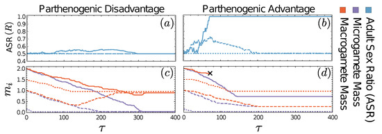In Figure A1a, we plot the ASR, R, as a function of . In line with expectations, we see that when is large (i.e., large parthenogenic disadvantage), a 1:1 Fisherian sex ratio is maintained. However, as is lowered (i.e., moving towards parthenogenic advantage), the sex ratio becomes increasingly biased towards microgamete producers. At a critical value, the first solution in Equation (A38) exceeds the second, and microgamete producers entirely displace macrogamete producers.