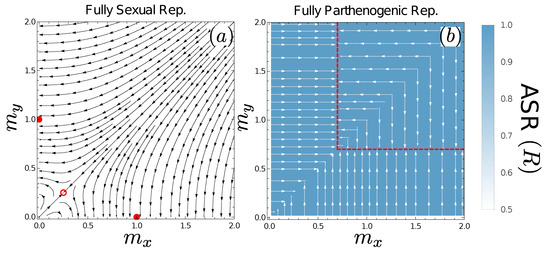 Evolutionary Dynamics under Fully Sexual or Fully Parthenogenic Reproduction. Arrows show the evolutionary trajectories in the limit (see Equations (5) and (6) for panel (a) and Equation (7)) for panel (b)). Open red circles give unstable equilibrium points of the evolutionary dynamics, red disks stable equilibrium points, and dashed red lines stable manifold points. The colour (heatmap) indicates the ASR; the heatmaps do not show any responses to gamete sizes because ASR is always under fully sexual reproduction and 1 under fully parthenogenetic reproduction. The heatmaps are uniform (and thus relatively uninteresting) but are given to enable direct comparison to later figures.