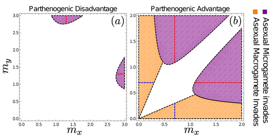 Invasion potential of asexuals when (a) and (b) . Asexuality invades more easily, and can do so via mutations in either type, in (b) where parthenogenesis brings about a survival advantage. Microgametes can do so in (b), in the purple regions, which are coincident with the regions in which microgametes can drive macrogametes extinct in the absence of mutations to asexuality (see Figure 4). Note and that the plane contains regions where y is the macrogamete producer (above the diagonal) as well as x being the macrogamete producer (below the diagonal); also note the sightly larger range of the plane depicted in (a), to make the microgamete invasion region visible. Isogamous sex occurs along the diagonal, where isogamous sex, should it be stable against deviating gamete sizes (as it is in (b)), is also protected against invasion of asexual mutants as indicated by the white region in (b). Following the successful invasion of an asexual, the resulting evolutionary dynamics are governed by Equation (7), taking the population to a state in which parthenogens produce gametes of size , denoted by red-dashed lines for asexuals derived from microgametes and blue-dashed lines for asexuals derived from macrogametes.