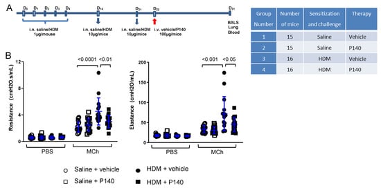 The effect of the P140 peptide in a chronic model of HDM-induced airway inflammation in BALB/c mice. (A) 9-week-old female BALB/c mice were sensitized on days 0, 1, 2, 3, 4 by i.n. administration of HDM extract (Stallergenes; 1 µg extract in 25 µL saline). They were challenged with 10 µg extracts on days 14 and 21. Mice were treated by i.v. injection (4 mg/kg body weight) of P140 or vehicle alone on day 22. BALs, lung tissues (total or washed), and blood were collected at day 31. (B) Airway resistance (R, cmH2O.s.mL−1) and airway elastance (cmH2O.mL−1) in response to aerosolized PBS and MCh (50 mg/mL, i.e., 0.26 M, in PBS) assessed by FlexiVent technique in anaesthetized mice. The data are presented as the mean ± SEM (n = 15–16 mice per group from two independent experiments).