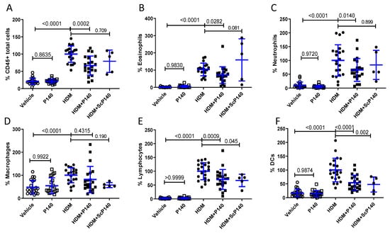 To determine to what extent this remarkable effect of P140 was linked to cell-driven inflammation in the lungs, we studied the cellularity of BALF collected from mice that received saline or HDM and were treated or not by P140 (Figure 3). Several independent experiments were performed to confirm the robustness of the P140 activity. As expected, the overall percentage of total CD45+ leukocytes was significantly raised in the BALF from HDM-sensitized and challenged mice (Figure 3A). This increased cell number was related to the influx of numerous cell subtypes in the lungs, especially eosinophils, neutrophils, macrophages, total lymphocytes and dendritic cells (DCs) (Figure 3B–F). Taking into account the results obtained with the control peptide ScP140 that displayed moderate but statistically significant effects on the percentage of BALF lymphocytes and DCs, the effect of P140 could be highlighted on eosinophils and neutrophils. The percentage of eosinophils and neutrophils was decreased upon P140 treatment by 35% (p = 0.0282) and 36% (p = 0.0140), respectively, with no concomitant effect of the ScP140 peptide (Figure 3B,C).
