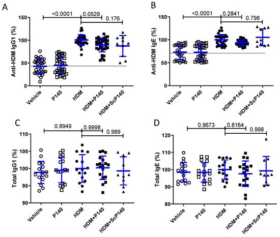 Effect of the P140 peptide on the levels of circulating anti-HDM IgG and IgE antibodies. The serum levels of specific IgG1 and IgE antibodies to HDM (A,B) and of IgG1 and IgE (C,D) were measured by ELISA. The level of Ig is expressed in percentage of respective HDM groups. The horizontal line indicates the background of the respective assays. The data are presented as the mean ± SEM (n = 32 mice per group from four independent experiments).