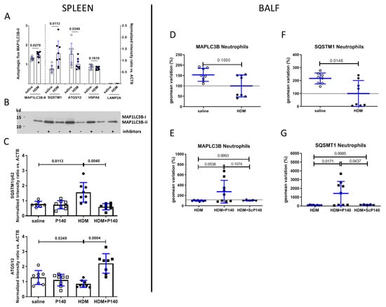 Measurement of autophagy markers in total splenocytes and BAL neutrophils collected from mice from HDM-sensitized and challenged mice. Nine-week-old female BALB/c mice were sensitized and challenged intranasally as indicated in Figure 2A. They receive vehicle, P140 or ScP140 intravenously at day 22; BALFs and spleens were collected at day 31. (A,B) Western immunoblotting and semi-quantification of five autophagy markers present in the spleen extracts from mice that received saline only or that were sensitized and challenged by HDM, and were treated or not with P140 (n = 8 in each group). The data are presented as the mean ± SEM. In (A), the autophagic flux (left part) corresponds to the ratio of MAP1LC3-II protein expression found in cells incubated in the presence or absence of bafilomycin A1. In (A) (right part) and (C), the expression of the other proteins, as measured by densitometry of Western blots, was normalized with regard to the β-actin/ACTB level. (D–G) Flow cytometry semi-quantification of autophagy markers present in the neutrophil population present in the BALF from mice that received saline only or that were sensitized and challenged by HDM with or without treatment with P140. Two markers were tested, namely MAP1LC3B (D,E) and SQSTM1 (F,G). The results generated with other cell types are shown in the Figure S2. The data are represented as the mean variation ± SEM of the geomean (in%). The horizontal lines indicate the 100% level. Saline, n = 8; HDM, n = 8; HDM + P140, n = 9; HDM + ScP140, n = 5. Pooled data from 2 independent experiments.