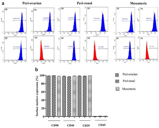 MSCs-specific cell-surface markers (CD90, CD44, and CD29) are well documented in rodent MSCs and serve as identifiers of these types of stem cells [,,,]. Our results show that ASCs at the third passage isolated from different anatomically sites shared a similar immunophenotype expression of CD90, CD44, and CD29 with a non-significant difference. These results are in agreement with the results of Kaewkhaw et al. []. We detected minor contaminating hematopoietic cells indicated by the positive CD45 expression, similar to Schäffler and Büchler [], where they mentioned that ASCs lose the expression of hematopoietic markers with several passages.