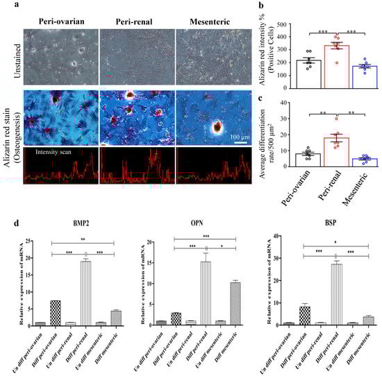 Osteogenic differentiation of ASCs. Light microscopy photographs showed that ASCs at the third passage differentiated into osteocyte lineages. (a) Osteogenic differentiation of ASCs from different harvesting sites, peri-ovarian, peri-renal, and mesenteric adipose tissue. Scale bar represents 100 μm. (b) Quantitative analysis of Alizarin red staining intensity of ASCs. (c) The average differentiation rate of ASCs from various harvesting sites. (d) RT-qPCR evaluation of osteogenic specific genes, Bone Morphogenetic Protein 2 (BMP2), Osteopontin (OPN), and Bone Sialoprotein (BSP) from the various harvesting sites. Values are presented as the mean ± SD with the one-way analysis of variance (ANOVA) followed by Tukey’s post hoc test * p < 0.05, ** p < 0.01, *** p < 0.001. The shown data are representative of four independent experiments.