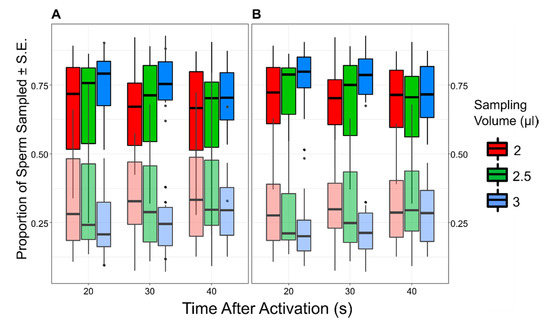 The boxplots show the proportion of sperm collected from the FRF (bright colors) and water (dull colors). Each box represents the value for a specific combination of time from activation (TA) and sampling volume (SV). In (A), the complete dataset is shown. In (B), data from trial 3 and 13 have been removed.