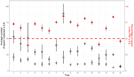 The average (± S.E.) number of sperm collected in the nine replicates of each trial. The number of sperm collected in the FRF (circles) is higher than in the control (stars) in all but two cases (trials #3 and #13). Red diamonds represent the average percentage of sperm collected in the FRF in the nine combinations of TA and SV (± S.E.) within each trial. The red dashed line represents 50%: values (diamonds) above the line represent trials where the majority of sperm (>50%) that reached the wells were collected from the FRF well.