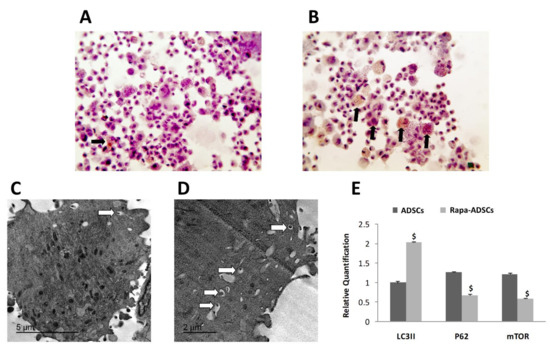 The effect of rapamycin preconditioning on autophagosomes formation in ADSCs. (A,B) Autophagosomes are immunohistochemically labeled with LC3II antibodies; magnification 400×. Black arrows indicate LC3II-positive autophagosomes inside ADSCs. (A) Non-preconditioned ADSCs, (B) Rapamycin (50 nM/L) preconditioned ADSCs. (C,D) The effect of rapamycin preconditioning on autophagic ultrastructures; white arrows indicate autophagosomes. (C) Non-preconditioned ADSCs, (D) Rapamycin (50 nM/L)-preconditioned ADSCs. (E) Effects of 50 nM/L rapamycin on expression of LC3II, p62 and mTOR genes in non-preconditioned and preconditioned ADSCs. Statistical significance, $ = p < 0.01.