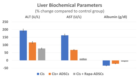 The impact of rapamycin-preconditioned ADSCs on liver biochemical parameters; ALT, AST and albumin, after cisplatin (Cis)-induced liver damage.