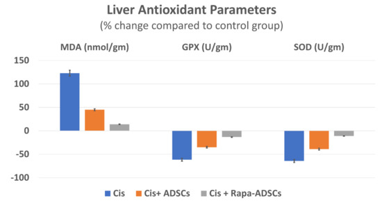 The effect of rapamycin-preconditioned ADSCs on liver antioxidative potential; MDA, GPX and SOD, after cisplatin (Cis)-induced liver damage.