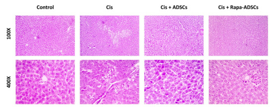 Photomicrographs showing the effect of administering rapamycin-preconditioned ADSCs on liver histopathological picture in cisplatin (Cis)-induced liver damage. Cis, cisplatin (i.p. injection of 5 mg/kg in 0.9% saline) group, Cis + ADSCs, cisplatin group receiving ADSCs (one million cells, intravenous in tail vein) and Cis + Rapa-ADSCs, cisplatin group receiving same number of ADSCs preconditioned with rapamycin (50 nM/L, 2 h prior to administration). In the control group, normal liver histological picture was evident. In the cisplatin group, the liver showed marked degenerative and inflammatory changes, including distorted shape of hepatic lobules, inflammatory cells infiltration, necrotic hepatocytes and extensive vacuolations. In the cisplatin group that received ADSCs, the histopathological picture was improved with partially restored hepatic architecture and few degenerative lesions and vacuolations. Finally, in the cisplatin group receiving rapamycin preconditioned ADSCs, the best histological improvements were achieved in the liver compared to other groups, with near normal hepatic microscopic structure.