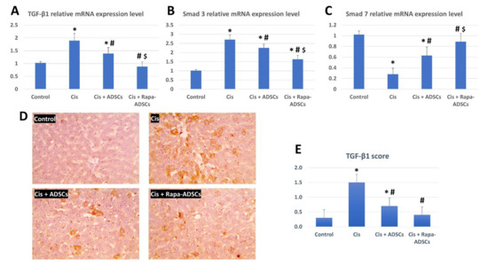 The effects of administering rapamycin-preconditioned ADSCs on liver TGF-β1/Smad signaling pathway in cisplatin (Cis)-induced liver damage. (A) TGF-β1 relative mRNA expression in the study groups. (B) Smad3 relative mRNA expression in the study groups. (C) Smad7 relative mRNA expression in the study groups. (D) Immunohistochemical staining of TGF-β1 in the liver tissue in the different groups, magnification 400×. (E) TGF-β1 score from the images in (D) from the different studied groups. Cis, cisplatin (i.p. injection of 5 mg/kg in 0.9% saline) group; Cis + ADSCs, cisplatin group receiving ADSCs (one million cells, intravenous in tail vein); Cis + Rapa-ADSCs, cisplatin group receiving same number of ADSCs preconditioned with rapamycin (50 nM/L, 2 h prior to administration). Statistical significance, * vs. control group (p < 0.01), # vs. Cis group (p < 0.01) and $ vs. Cis+ADSCs group (p < 0.05).