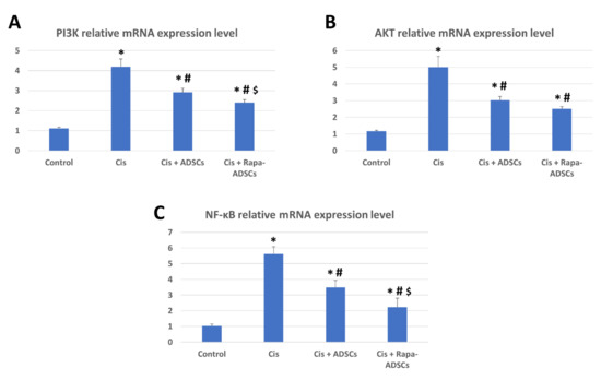 The relative expression of PI3K, AKT and NF-κB mRNA was significantly increased (4, 5 and 5.5 times, respectively, p < 0.01, compared to their control levels) following cisplatin administration (Figure 7). Following ADSCs treatment, the expression levels of PI3K and AKT were significantly reduced (p < 0.05). However, this reduction was best achieved in the rat group receiving rapamycin preconditioned ADSCs.