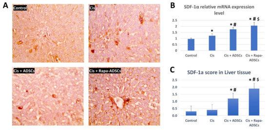 The levels of SDF-1α mRNA and protein expression in the liver were evaluated in the different study groups, and the results are shown in Figure 8. The mRNA expression of SDF-1α gene was not significantly increased in the cisplatin group, but it was significantly increased in the group receiving ADSCs, and the highest levels were obtained in the group receiving rapamycin-preconditioned ADSCs (p < 0.01. Figure 8B). Additionally, the tissue levels of SDF-1α were immunohistochemically evaluated in liver sections of the different study groups (Figure 8A,C). The mean number and overall area of the SDF-1α positive cells in the liver were also significantly higher in the group receiving ADSCs, while the highest SDF-1α levels were in the group receiving rapamycin-preconditioned ADSCs.