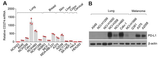CD274 and its translated protein PD-L1 expression in various cancer cells. (A) CD274 mRNA expression in cultured cancer cell lines. CD274 mRNA levels were measured by using quantitative real-time polymerase chain reaction (qRT-PCR) and expression levels were normalized to the human 36B4 gene. The values represent the mean ± SD. Experiments were performed in triplicates. Red dot indicates the value of the individual sample. (B) PD-L1 proteins in seven lung cancer and three melanoma cells were measured by using western blotting.
