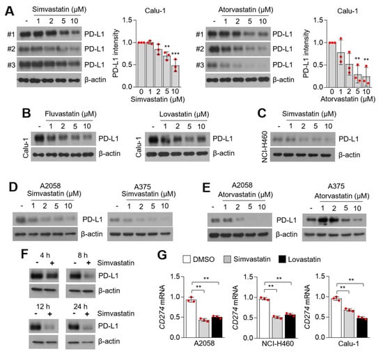 PD-L1 is decreased in statins-treated lung cancer and melanoma cells. (A) PD-L1 expression in simvastatin and atorvastatin-treated Calu-1 lung cancer cells. Calu-1 cells were incubated with simvastatin and atorvastatin at the indicated concentration for 12 h. DMSO was used for vehicle control (-). PD-L1 protein levels were measured by using western blotting and PD-L1 protein intensity was both quantified and represented by Image J and Graphpad Prism. Each PD-L1 protein level in the statins-treated sample was compared to the vehicle sample. The values represent the mean ± SD for the three independent experiments (#1, #2, and #3) performed. ** p < 0.01 and *** p < 0.001 by one-way ANOVA, followed by an appropriate post hoc test for the comparison between two experimental groups. (B) PD-L1 expression in fluvastatin and lovastatin-treated Calu-1 lung cancer cells. Calu-1 cells were incubated with fluvastatin and lovastatin at the indicated concentration for 12 h. (C) PD-L1 expression in simvastatin-treated NCI-H460 lung cancer cells. Different concentrations of simvastatin were treated for 12 h, as indicated. (D,E) PD-L1 expression in simvastatin (D) or atorvastatin (E)-treated A375 and A2058 melanoma cells. Different concentration of statins were treated for 12 h. (F) PD-L1 expression in simvastatin-treated A2058 melanoma cells in a time-dependent manner, as indicated. (G) CD274 mRNA-encoding PD-L1 protein expression in simvastatin (5 µM for 8 h) and lovastatin (5 µM for 8 h)-treated A2058, NCI-H460, and Calu-1 cells. CD274 mRNA was measured by using qRT-PCR. Values represent mean ± SD. Experiments were performed in triplicates. ** p < 0.01 by one-way ANOVA, followed by an appropriate post hoc test for the comparison between two experimental groups.