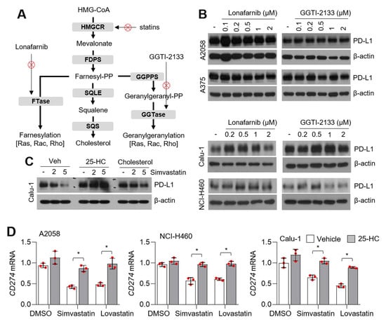 Intracellular cholesterol is associated with the suppression of PD-L1 in statins-treated lung cancer and melanoma cells. (A) Schematic representation of the mevalonate and cholesterol biosynthesis pathways. (B) Lonafarnib (a selective inhibitor of FTase) and GGTI-2133 (a selective inhibitor of GGTase) did not decrease PD-L1 expression. Lung cancer (Calu-1 and NCI-H460) and melanoma (A375 and A2058) cells were incubated with different concentrations of lonafarnib or GGTI-2133 for 12 h, as indicated. Protein levels were measured by using western blotting. (C) Supplement of cholesterol reversed the suppression of PD-L1 by statins. Calu-1 lung cancer cells were pre-incubated with 20 µM of 25-hydroxycholesterol (25-HC) and 0.5 mM of water soluble cholesterol for 6 h, and then cells were further incubated with 2 or 5 µM of simvastatin for 8 h. After drug treatment, protein levels were measured by using western blotting. (D) 25-HC reversed the suppression of CD274 by statins treatment. Cells were incubated for 6 h in the absence or presence of 25-HC (20 µM) and then cells were further incubated with 5 µM of simvastatin or lovastatin for 8 h. CD274 mRNA levels were measured by using qRT-PCR. Values represent mean ± SD. Experiments were performed in triplicates. * p < 0.05 by Student’s t-test for two experimental comparisons.
