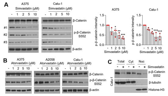 Statins decreased phosphorylation of β-catenin-S552. (A) Suppression of β-catenin-S552 phosphorylation in simvastatin-treated lung cancer (Calu-1) and melanoma (A375) cells. Cells were incubated with different concentrations of simvastatin for 6 h. Protein expression was confirmed by using western blotting. Phosphorylated β-catenin protein levels were measured by using western blotting. Phosphorylated β-catenin intensity was quantified and represented by Image J and Graphpad Prism. Each phosphorylated β-catenin-S552 protein level in the statins-treated sample was compared to the vehicle sample. The values represent the mean ± SD from the three independent experiments (#1, #2, and #3) performed. Values represent mean ± SD. * p < 0.05, ** p < 0.01 and *** p < 0.001 by one-way ANOVA, followed by an appropriate post hoc test for the comparison between two experimental groups. (B) Atorvastatin suppressed β-catenin-S552 phosphorylation in A375, A2058, and Calu-1 cells. (C) Simvastatin decreased nuclear β-catenin. Cells were incubated with DMSO (as a vehicle control) or simvastatin (10 µM) for 8 h and nuclear β-catenin protein levels were measured by using western blotting.