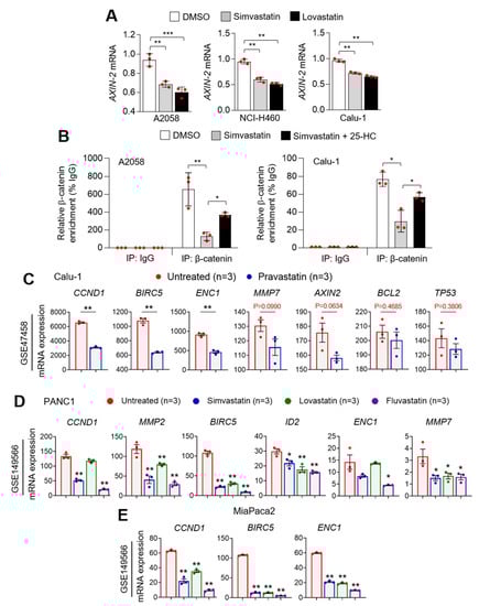 Statins decreased β-catenin target genes. (A) Simvastatin and lovastatin attenuated AXIN-2 mRNA, as a β-catenin target gene, in lung cancer and melanoma cells. Lung cancer (NCI-H460 and Calu-1) and melanoma (A2058) cells were incubated with simvastatin (5 µM) or lovastatin (5 µM) for 6 h, as indicated. AXIN-2 was measured by using qRT-PCR. Experiments were performed in triplicates. All plots indicate the mean ± SD. ** p < 0.01 and *** p < 0.001 by one-way ANOVA, followed by an appropriate post hoc test for the comparison between two experimental groups. (B) Chromatin immunoprecipitation (ChIP) for β-catenin followed by ChIP-qPCR in A2058 and Calu-1 cells confirmed a chromatin enrichment of β-catenin at the CD274 promoter loci (600 bp upstream from the transcription start site). Cells were incubated for 6 h in the absence or presence of 25-HC (20 µM) and then cells were further incubated with 5 µM of simvastatin for 8 h. All plots indicate the mean ± SD. Experiments were performed in triplicates. * p < 0.05 and ** p < 0.01 by one-way ANOVA, followed by an appropriate post hoc test for the comparison between two experimental groups. (C) β-catenin target genes, such as CCND1, BIRC5, ENC1, MMP7, AXIN-2, BCL2, and TP53, mRNA expression levels were measured in pravastatin-treated Calu-1 cells using a publicly available microarray dataset (GSE47458). All plots indicate the mean ± SD. ** p < 0.01 by Student’s t-test for two experimental comparisons. (D,E) CCND1, MMP2, BIRC5, ID2, ENC1, and MMP7 mRNA levels were measured in simvastatin, lovastatin, or fluvastatin-treated (D) PANC1 and (E) MiaPaca2 pancreatic cancer cells using a publicly available microarray dataset (GSE149566). All plots indicate the mean ± SE. * p < 0.05 and ** p < 0.01 by one-way ANOVA, followed by an appropriate post hoc test for the comparison between two experimental groups.