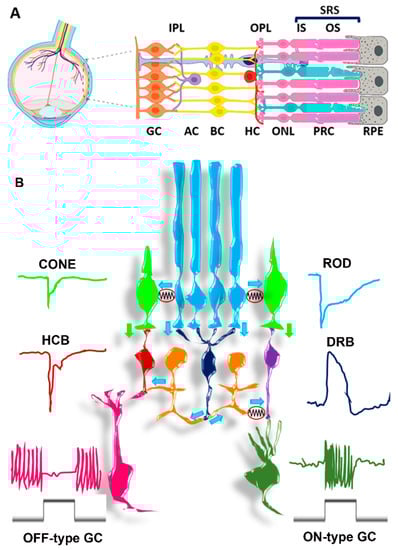 The adult mammalian retina is a highly specialized tissue, localized in the posterior region of the eye, responsible for light sensing and pre-processing of the visual information that is readily delivered to the brain. As shown in Figure 1A, the retina has five major retinal cell types organized in three main cell layers separated by two synaptic layers. The visual experience starts in retinal photoreceptors (PRC) upon light stimuli conversion in electrical signals that feed into retinal circuitries for neural computation [,]. Specifically, PRC in the outer nuclear layer (ONL) transmit the neural signal to bipolar cells (BC) in the inner nuclear layer (INL) that relay this information to ganglion cells (GC), the only retinal cells whose axons exit the retina via the optic nerve. Amacrine and horizontal cells (AC and HC) in the INL interconnect with either PRC, BC, or GC to integrate PRC-born signals, letting the visual system operate over a range of environmental light intensities spanning about 14 log units as parallel networks [] extracting relevant features from the visual scene [,]. Figure 1B provides an example of how retinal circuitries let the visual system operate over a large range of light intensities via the parallel processing of rod and cone signals (reviewed in []). As shown in Figure 1B, cones hyperpolarize in response to light and connect with BC that either hyperpolarize (hyperpolarizing cone BC—red) or depolarize (depolarizing cone BC—purple) in response to light. Hyperpolarizing BC cells connect to OFF-type GC that reduce their firing rate in response to light. In turn, depolarizing cone BC connect to ON-type GC that increase their firing rate in response to light. Through these, ON and OFF GC cone-borne signals are relayed to higher visual centers enabling vision in day-light. However, cones do not have enough sensitivity to operate in dim light levels, preventing common tasks such as driving a car at night. Rods (cyan) hyperpolarize in response to light and have enough sensitivity to operate in dim light and connect with rod BC (blue) that respond to light with a depolarization. Rod BC do not establish synaptic contact with GC and rod-born signals travel through a specialized AC type (bistratified or AII AC-orange) to reach cone bipolar cells (Figure 1B). In addition to this primary rod pathway, a second pathway directly connects rod to cones (Figure 1B).