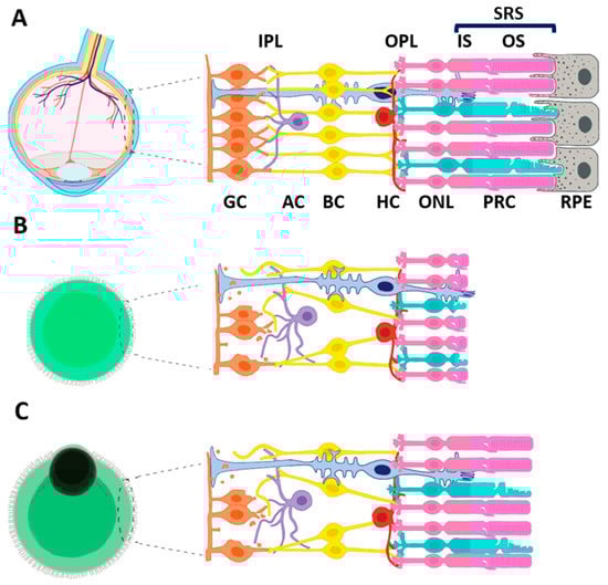 As shown in Figure 2A, mature, healthy PRC are distinctively characterized by their OS, a highly specialized light-sensitive ciliary organelle where phototransduction takes place. OS are dynamic structures undergoing continuous renewal. New disc membranes are added at the base, and old discs shed from the distal portion phagocyted by the overlaying RPE cells [].