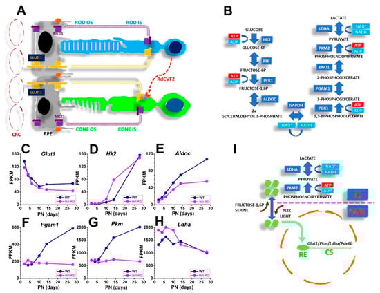 The retina generates lactate from glucose despite the concurrent oxidative metabolism providing enough ATP to support the Na/K pump operation required to balance ion influx in darkness and prevent Ca2+ build-up [,,]. The conversion of a large fraction of pyruvate into lactate in the presence of oxygen is a hallmark of aerobic glycolysis and requires Ldha expression to assemble LDH5. However, the metabolic reprogramming associated with aerobic glycolysis is not limited to the high Ldha expression and requires the increased expression of several enzymes involved in glycolysis, as shown in Figure 3B.