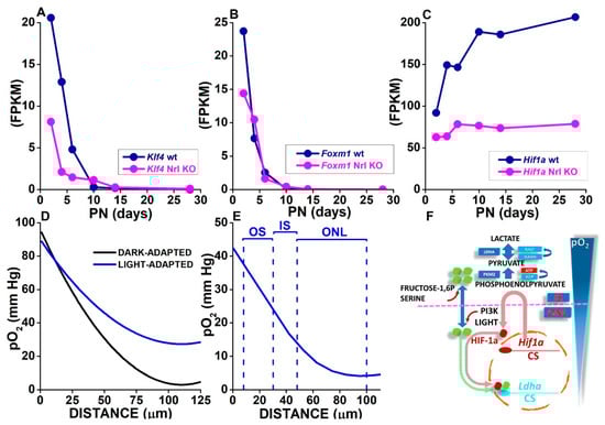 Metabolic reprogramming of rods leads to the expression of isoforms characteristic of aerobic glycolysis, such as HK2 [] and PKM2 [,,], the last one playing a pivotal role in promoting aerobic glycolysis in photoreceptors [,]. Rod precursors undergo metabolic reprogramming to aerobic glycolysis during postmitotic specification steps, as shown in Figure 3C–H, which plots publicly available data from the RetSeq Database (https://retseq.nei.nih.gov/, accessed on 15 April 2021) []. The increased expression of Hk2, Aldo, Pgam1, and Pkm after PN5 is consistent with the development of OS and light responses in rodent rods by PN8 and PN13, respectively []. Intriguingly, cells lacking the rod-specific transcription factor Nrl fail to upregulate Pkm and Pgam1 expression after PN5. The increased Pkm expression in rods matches data indicating rod expression of the alternative splicing variant Pkm2 [,,,], which plays a crucial role in driving the metabolic reprogramming of photoreceptors.