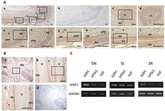 Localization of Sfrp1 in rat dental tissues and expression of SFRP1 mRNA in human dental cells. (A) Immunohistochemical staining of mandibular incisors of 8-week-old male Wistar rats with an anti-Sfrp1 antibody. Lower magnification images of anti-Sfrp1 (a) and rabbit control IgG (b) staining of mandibular incisor. (c,e,g,i) Higher magnification images in (a). (d,f,h,j) Higher magnification images of black boxes in (a,c,e,g,i). No positive staining was detected in the cervical loop (c,d). Faint positive staining was confirmed in the inner enamel epithelium (e,f), dental pulp (e,f), preodontoblast layer (e–h), and ameloblast layer (g,h). Intense positive staining was found in the odontoblast layer (g–j). (B) Immunohistochemical staining of mandibular first molar of 8-week-old male Wistar rats with an anti-Sfrp1 antibody (a–c) or rabbit control IgG (d). (b,c) Higher magnification images of black boxes in (a,b), respectively. Odontoblasts strongly expressed Sfrp1 compared with cells in the dental pulp and periodontal ligament. (C) Semi-quantitative RT-PCR analysis of SFRP1 gene expression in hDPCs, hPDLCs, and hGFs. In all three specimens, SFRP1 was strongly expressed in hDPCs compared with one in hPDLCs and hGFs. RT-PCR, reverse transcription polymerase chain reaction; hDPC, human dental pulp cells; hPDLC, human periodontal ligament cells; hGF, human gingival fibroblasts. Experiments were performed in duplicate. Representative data are shown. Bars = 100 μm. IgG, immunoglobulin G; CL, cervical loop; IEE, inner enamel epithelium; P, dental pulp; Am, ameloblast; pOd, preodontoblasts; Od, odontoblasts; M1, first molar; M2, second molar; D, dentin; PDL, periodontal ligament.