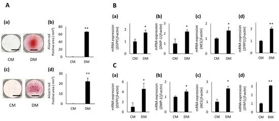 Mineralized nodule formation was confirmed in all three hDPCs cultured in DM for 5 days; however, no nodule formation was observed in cells cultured in CM (Figure 2A(a,c) and Figure S1A(a)). hDPCs exposed to DM had a significantly larger Alizarin Red S stained area, compared with cells exposed to CM (Figure 2A(b,d) and Figure S1A(b)). In addition, the expression of odontoblast-related genes, dentin sialophosphoprotein (DSPP), dentin matrix acidic phosphoprotein 1 (DMP1), and Nestin (NES) was significantly up-regulated in hDPCs cultured in DM for 3 days compared with cells cultured in CM (Figure 2B(a–c),C(a–c) and Figure S1B(a–c)). Moreover, the expression level of SFRP1 was higher in hDPCs treated with DM than in cells treated with CM (Figure 2B(d),C(d) and Figure S1B(d)).