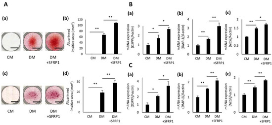 Gene expression of SFRP1 during odontoblastic differentiation of hDPCs. (A) Odontoblastic differentiation of hDPC-5N and -5I. Alizarin Red S staining images of hDPC-5N (a) and -5I (c) cultured in 10% FBS/α-MEM (control medium; CM) or CM with 2 mM CaCl2 (odontoblastic differentiation medium; DM) for 5 days. Experiments were performed in quadruplet. Representative data are shown. The Alizarin Red S-positive area of hDPC-5N (b) and -5I (d) cultured in CM or DM for 5 days. Gene expression of odontoblast related-markers, DSPP (a), DMP1 (b), NES (c), and SFRP1 (d) in hDPC-5N (B) and -5I (C) cultured in CM or DM for 3 days. Data are shown as the mean ± standard deviation (n = 3). * p < 0.05, ** p < 0.01. Scale bars = 5 mm. DSPP, dentin sialophosphoprotein; DMP1, dentin matrix acidic phosphoprotein 1; NES, Nestin.