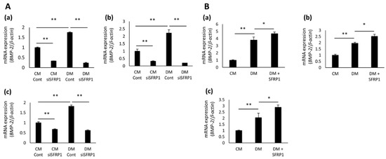 Effects of SFRP1 knockdown and SFRP1 stimulation on BMP-2 gene expression in hDPCs. (A,B) Gene expression of BMP-2 in hDPCs. Following the transduction of Cont or siSFRP1, hDPCs were cultured in CM or DM for 2 days (A). Non-transduced hDPCs were cultured in CM, DM, or DM+SFRP1 for 3 days (B). hDPC-5N (a), -5I (b), and -3R (c) were used in this study. Data are shown as the mean ± standard deviation (n = 3). * p < 0.05, ** p < 0.01.