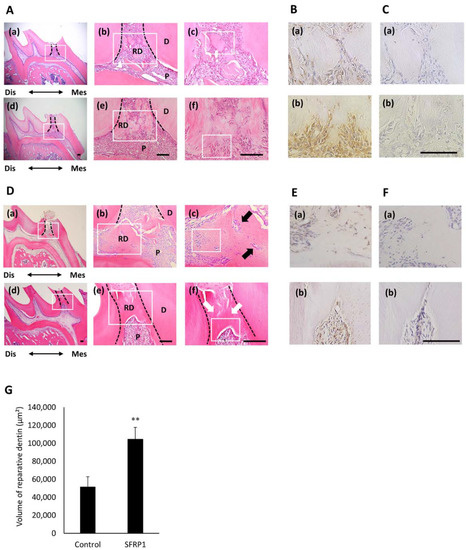 Effects of SFRP1 on reparative dentin formation after direct pulp capping treatment. (A) Images of HE-stained maxilla first molars from 10-week-old male Wistar rats after 2 weeks of direct pulp capping treatment. Representative images of specimens applied with nano β-TCP collagen scaffolds containing 0 (a–c) or 200 ng (d–f) rhSFRP1. (b,e) Higher magnification images of white boxes in (a,d). (c,f) Higher magnification images of white boxes in (b,e). Dotted lines indicate a border between primary dentin and newly formed reparative dentin. Immunohistochemical staining for anti-Nes (B) and rabbit control IgG (C) antibodies in the serial sections of (A). These images are higher magnifications of the areas in the white boxes in (c,f). (D) Images of HE-stained maxilla first molars from 12-week-old male Wistar rats after 4 weeks of direct pulp capping treatment. (b,e) Higher magnification images of white boxes in (a,d). (c,f) Higher magnification images of white boxes in (b,e). Dotted lines indicate a border between primary dentin and newly formed reparative dentin. Black arrows indicate embedded dental pulp cells in generated bone-like dentin. White arrows indicate dentinal tube-like structures in reparative dentin. Immunohistochemical staining for anti-Nes (E) and rabbit control IgG (F) antibodies in the serial sections of (D). These images are higher magnifications of the areas in the white boxes in (c,f). Representative images of five independent specimens treated with nano β-TCP collagen scaffolds containing 0 (a) or 200 ng (b) rhSFRP1. (G) The amount of newly formed reparative dentin in control and 200 ng rfSFRP1 groups after 4 weeks of direct pulp capping treatment. Data are shown as the mean ± standard deviation (n = 5). ** p < 0.01. Bars = 100 μm. rhSFRP1, recombinant human SFRP1; Dis, distal; Mes, mesial; D, dentin; P, dental pulp; RD, reparative dentin.