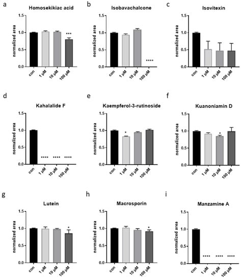 Compared to control treatment (1% DMSO), animals’ body size was significantly reduced by 100 µM homosekikiac acid, 1 µM kaemperol-3-o-rutinoside, 1 µM kaempferitin, 10 µM Kuanoniamine D, 100 µM lutein, 100 µM lupeol and 100 µM macrosporin (Figure 1a,e,f,g,h and Figure S1); while 100 µM isobavachalcone, 1, 10 and 100 µM kahalalalide F and 1, 10 and 100 µM manzamine A, 10 and 100 µM 8-OH-manzamine A, resulted in early L1-developmental arrest, and the small larvae were not detected by the system (Figure 1b,d,i and Figure S1). When checking the expression of the two mitochondrial stress fluorescent reporters, gst-4 and hsp-6, due to compromises in optimization of screening detection parameters, when nematodes were too small to be detected by the BioApplication, no GFP intensity could be measured (Supplementary Figures S2–S4 and Figure 2b,d,i). Regardless of these difficulties, quantified data showed that some of the treatment lowered the expression of gst-4, namely 1 and 10 µM hexaprenylhydroqinone, 100 µM homosekikaic acid, 10 µM 2-hydroxy-4-methoxyphenylacetonitrile, 1 µM isovitexin, 1 µM kaempferol-3-rutinoside, 1 and 10 µM 8-OH-manzamine A (Figure 2a,c,e and Figure S2a). Other treatments did not show significant results, although some displayed a trend in gst-4 expression (Figure 2b,f,g,h and Figure S2a). Conversely, 10 µM lupeol significantly increased the induction of the hsp-6 (Supplementary Figure S2b). The screening platform utilized in this study to search for compounds inducing mitochondrial hormesis, was previously developed and validated with genetic and pharmacological interventions specifically targeting different subunits of the ETC complexes (such as oligomycin) [13]. Here, using oligomycin as a positive control, we revealed inconsistent effects on animal size (Supplementary Figure S1a,b), likely ascribed to differences in the genetic background of the two mitochondrial stress reporter strains (gst-4 and hsp-6) or to mild size changes which fall below the threshold of detection of the automatic microscopy platform. Instead, clear alterations of transgenes expression were observed (Supplementary Figure S2a,b), which consistent with previous findings do not linearly correlate with the severity of the mitochondrial stress treatment [35].