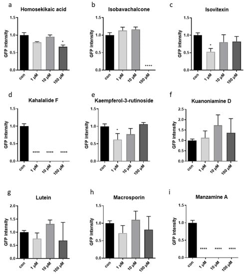GFP expression in gst-4::GFP reporter strain measured with the Cellomic ArrayScan in liquid culture. (a–i) GFP intensity was measured with the Cellomic ArrayScan in liquid culture. Worms were treated either with DMSO (1%) (con) or with one of the 9 selected compounds of marine origin, at three different concentrations. The animals were treated for 3 days (from L1 stage). Measurements are indicated as mean ± SEM. One-way ANOVA. In all panels, asterisks (*) denote statistical significance: * p value ≤ 0.05, **** p value ≤ 0.0001 compared with control.