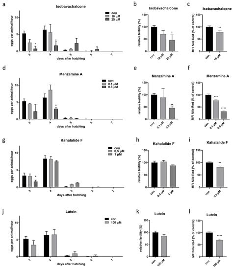 The effect of the four compounds was then first investigated on worms’ fertility, a health-related parameter of the germ cells often correlating with mitochondrial-driven changes in lifespan [19]. Worms were supplemented from embryos with different concentrations of isobavachalcone (10 or 25 µM), kahalalide F (0.5 and 1 µM), manzamine A (0.1 and 0.5 µM), lutein (10 and 100 µM) or 0.25% DMSO as control and the number of laid embryos per worm per hour as well as the total brood size were calculated across the entire fertile period. At the highest concentrations used, isobavachalcone and manzamine A reduced the fertility rate below 45% of control (Figure 3a,b,d,e), while a moderate reduction of fertility (although not statistically significant) was achieved with the highest doses of kahalalide F and lutein (Figure 3g,h,j,k). Mild mitochondrial stress extends lifespan and concurrently reduces the amount of fat content [36]. Thus, we then tested whether animals’ lean phenotype observed upon compound treatment correlated with the amount of Nile red, which stains C. elegans lysosome-related organelles, and nicely correlates with Oil red staining of fat compartments upon MMS [36]. To this end, we grew animals on plates containing the four hit compounds and Nile red [37] and found that all treatments led to a significant reduction of Nile Red signal, especially the highest dose of Manzamine (Figure 3c,f,i,l and Figure S5).