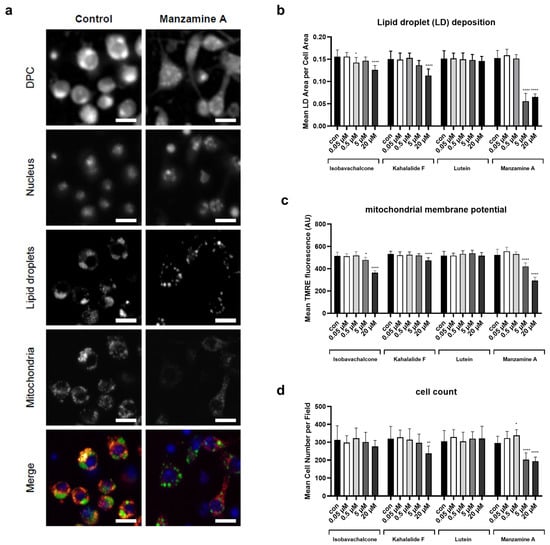 High content microscopy assay with Drosophila melanogaster S2R+ cells. S2R+ cells were incubated for 18 h with the different concentrations of the compounds Isobavachalcone, Kahalalide F, Lutein and Manzamine A. The control group was treated with DMSO (0.2%). (a) Representative picture of the high content staining in control and Manzamine A (20 µM) treated cells where merge is from nucleus (blue, Hoechst 33342), lipid droplets (green, BODIPY FL C12) and mitochondria (red, TMRE). Digital phase contrast is calculated from transmitted light images and shows the unstained cell morphology. Scale bar = 10 µm. (b) Quantification of mean LD area per cell. (c) Quantification of mean mitochondrial membrane potential per cell. (d) Quantification of cell number per field. Individual cells were analyzed from four fields per well of biological triplicates. One-way ANOVA for each compound, confidence interval 95%. In all panels, asterisks (*) denote statistical significance: * p value ≤ 0.05, ** p value ≤ 0.01, **** p value ≤ 0.0001 compared with control.