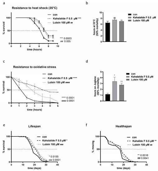 Lutein and kahalalide F promote health and lifespan. (a) Heat shock resistance over time in wild-type nematodes treated either with DMSO as control, or 0.5 µM kahalalide F or 100 µM lutein. (b) Bar graph showing the time (in hours) at which the 50% mortality was reached for each treatment. (c) Juglone resistance over time in wild-type nematodes treated either with DMSO as control, or 0.5 µM kahalalide F or 100 µM lutein, final Juglone concentration 200 µM. (d) Bar graph showing the time (in hours) at which the 50% mortality was reached for each treatment. (e) Lifespan, shown as % of surviving animals over time and (f) healthspan, calculated as % of moving animals, among surviving nematodes over time. Asterisks (*) denote statistical significance: * p value ≤ 0.05, **,## p value ≤ 0.01, ***,### p value ≤ 0.001, ****,#### p value ≤ 0.0001 compared with control.